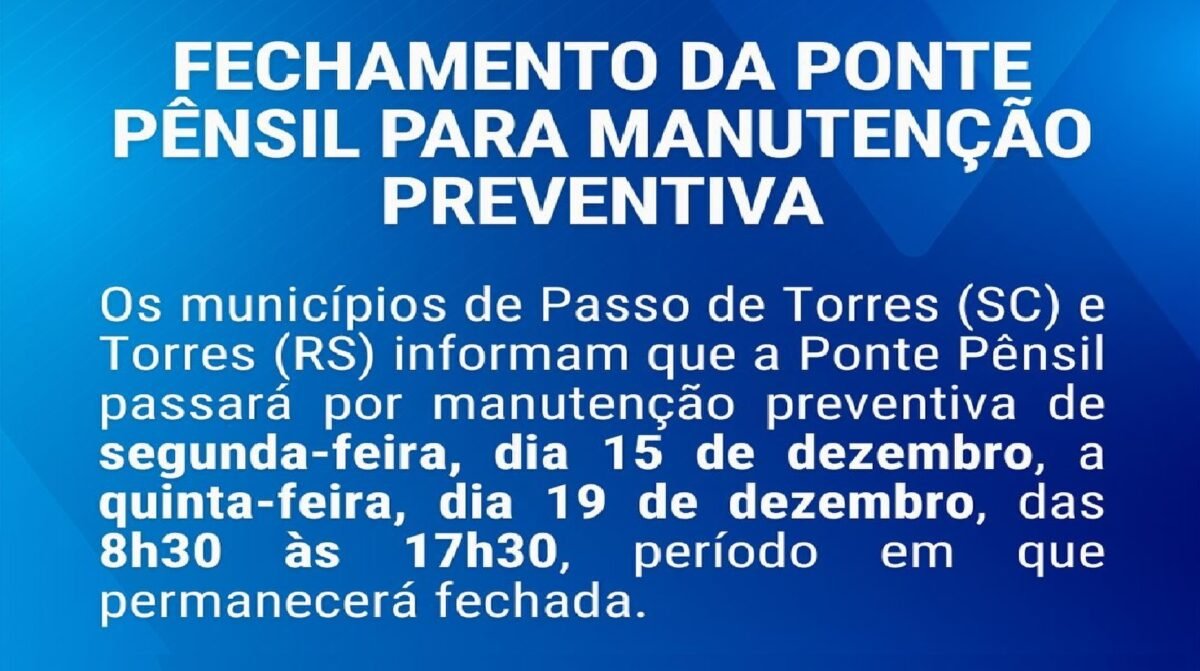 Os municípios de Passo de Torres (SC) e Torres (RS) informam que a Ponte Pênsil passará por manutenção preventiva de segunda-feira, dia 15 de dezembro, a […]