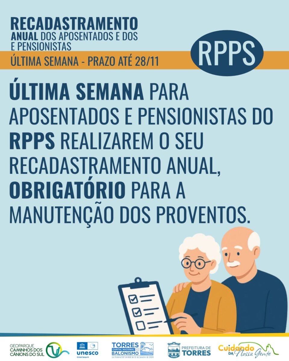 A Prefeitura de Torres informa que esta é a última semana para aposentados e pensionistas do Regime Próprio de Previdência Social (RPPS) realizarem o recadastramento anual, […]