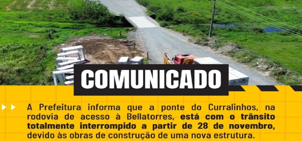 A Prefeitura de Passo de Torres informa que a ponte do Curralinhos, na rodovia de acesso à Bellatorres, está com o trânsito totalmente interrompido a partir de 28 de novembro, devido às obras de construção de uma nova estrutura.